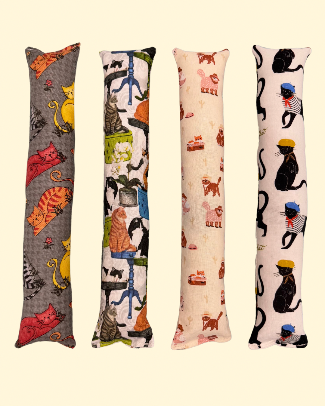 each cat kicker is made from 100% cotton fabric, machine stitched for durability, and filled with stuffing and 3 large scoops of catnip silvervine mixture!