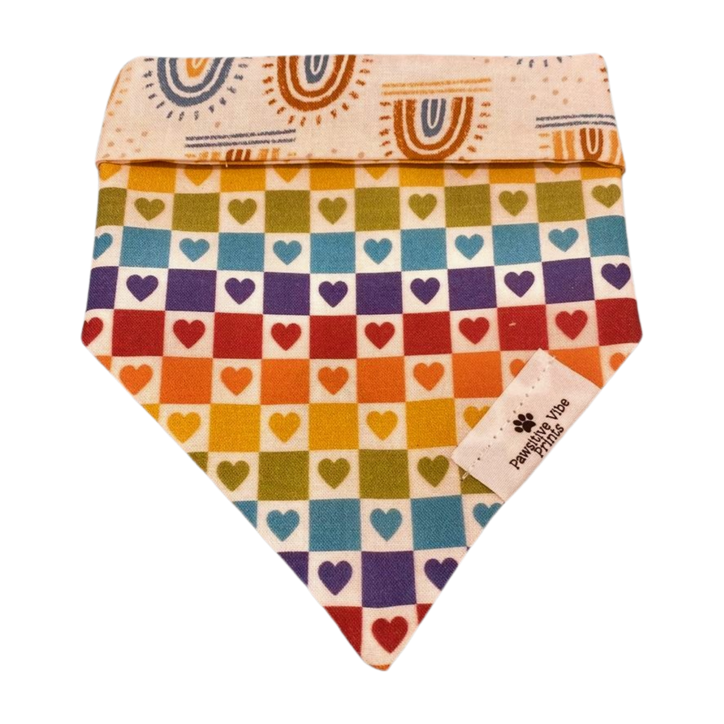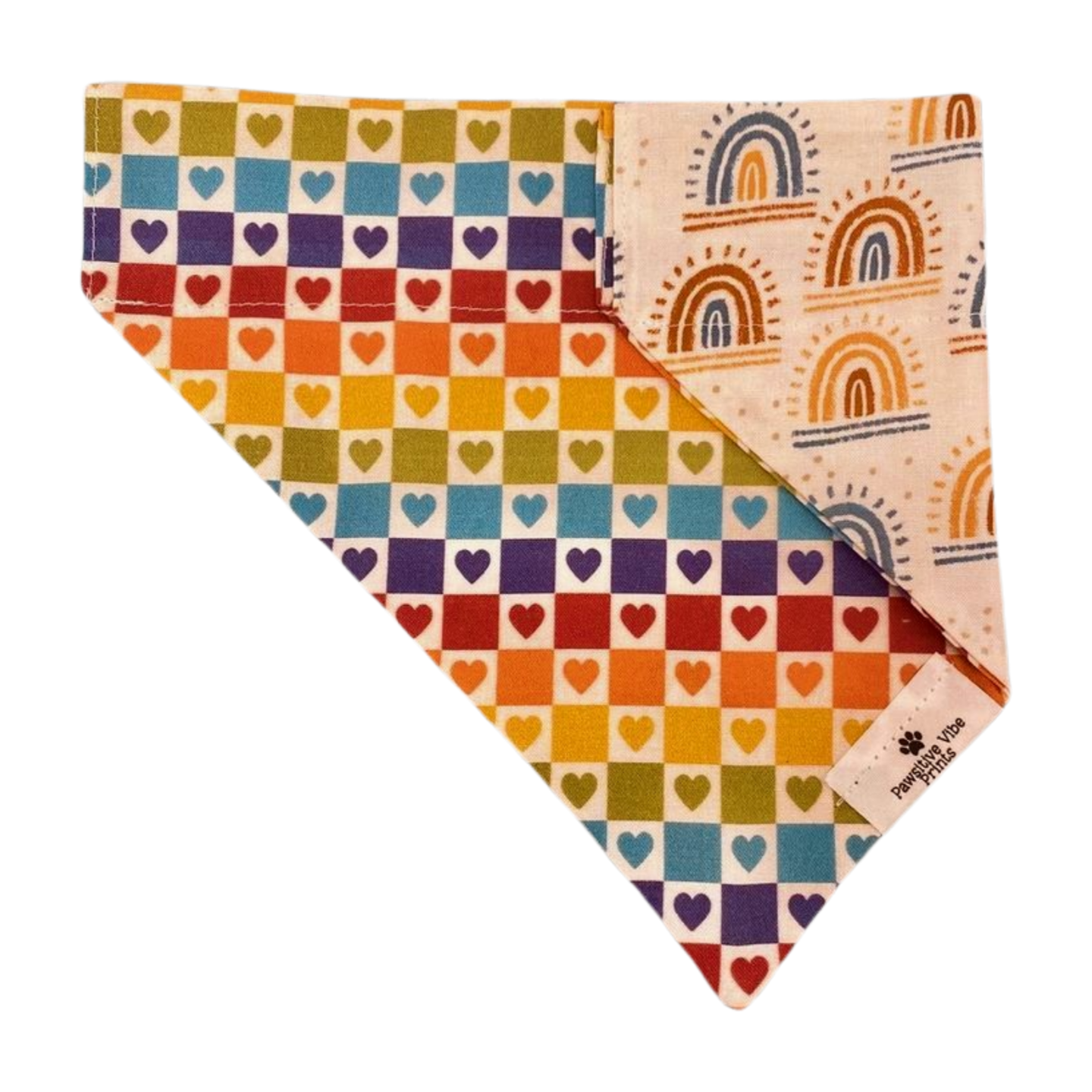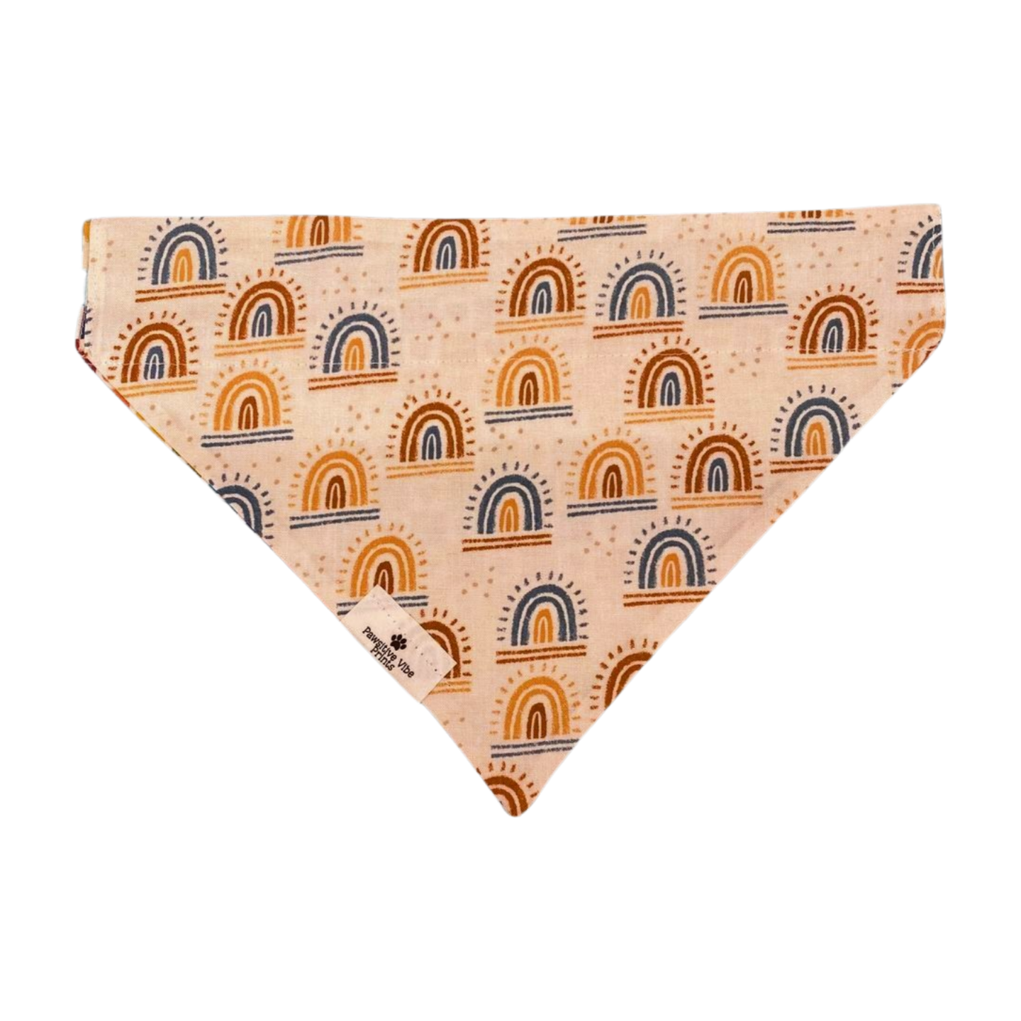Over the collar design makes it so the bandana stays on as long as the collar is on. This bandana has two prints for the price of one!