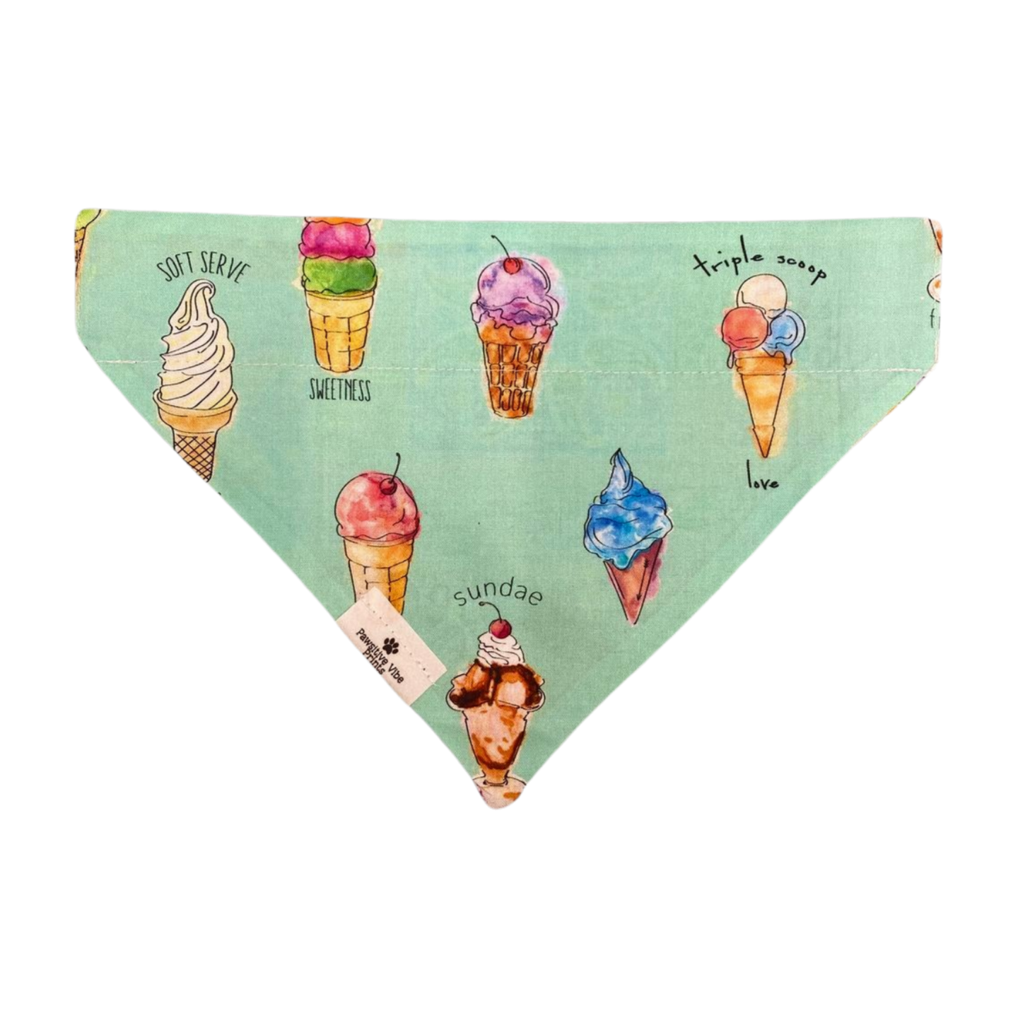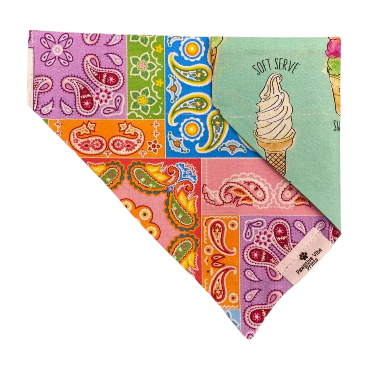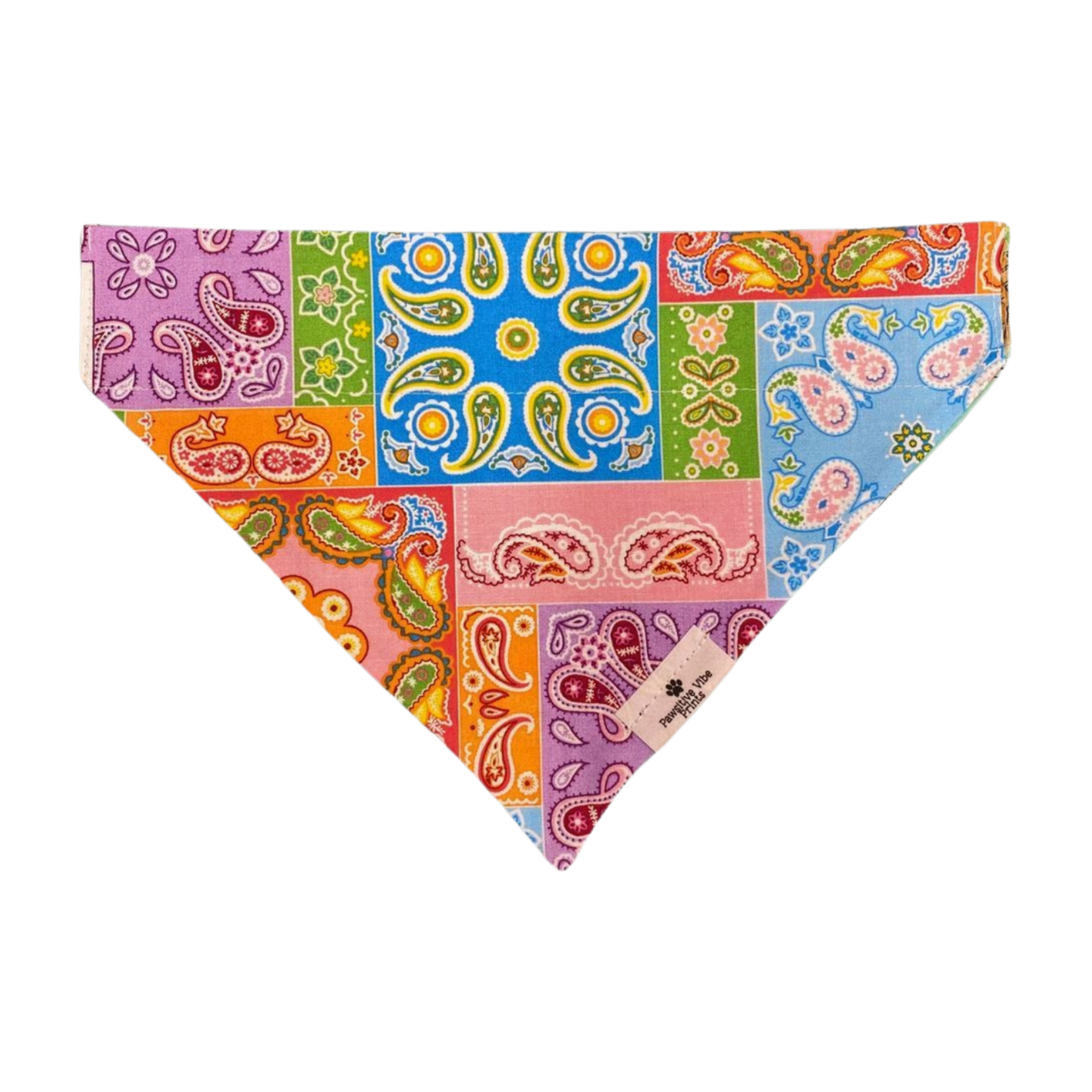 Over the collar design makes it so the bandana stays on as long as the collar is on. This bandana has two prints for the price of one!