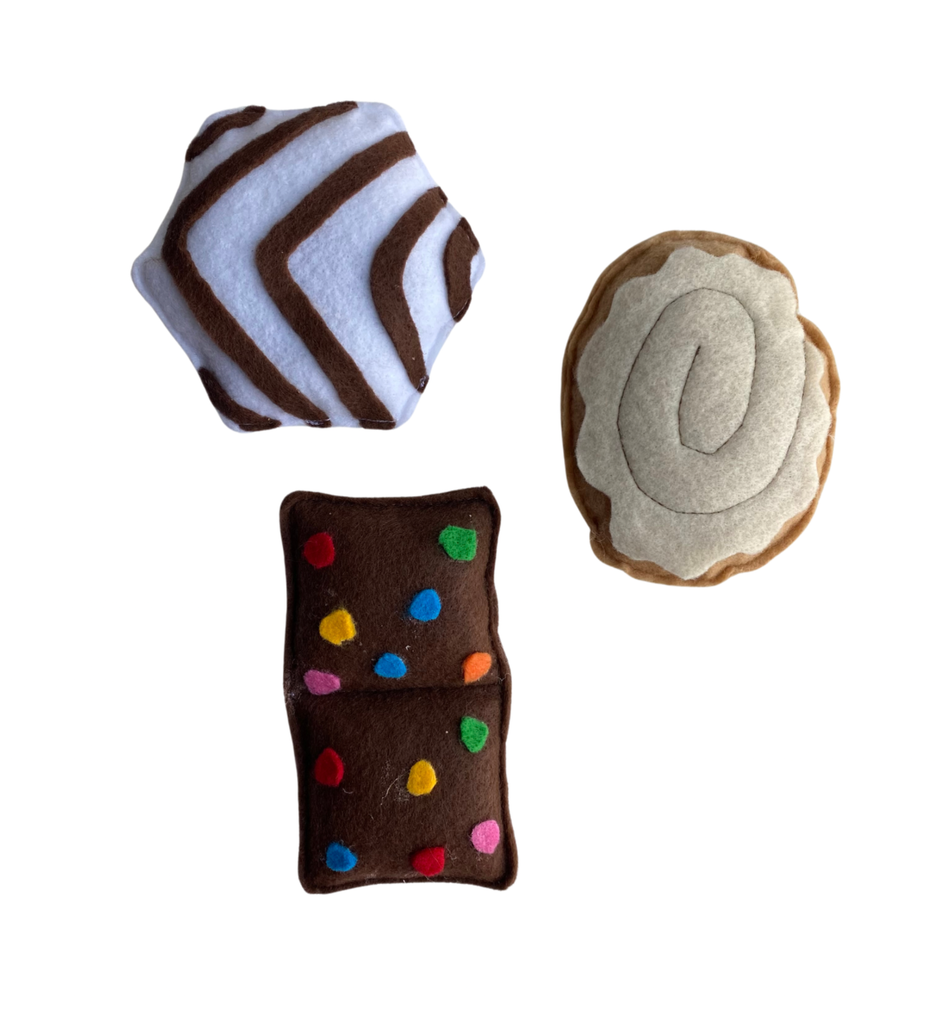 Note**Since these are handmade, there may be small variations in stitching and patterns, but all toys are made from the same kind of felt and thread.