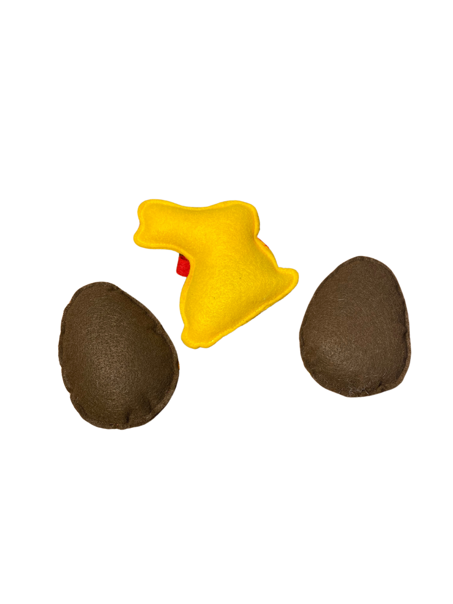 This set features a charming rabbit pal and two chocolate egg-shaped toys, providing a festive fusion of fun for your cat.