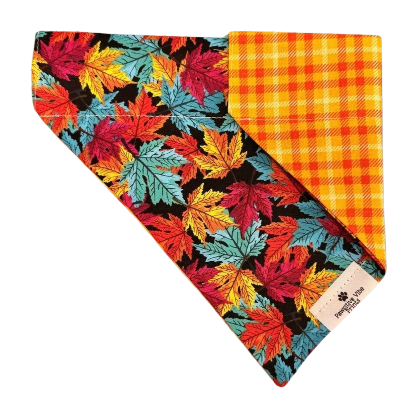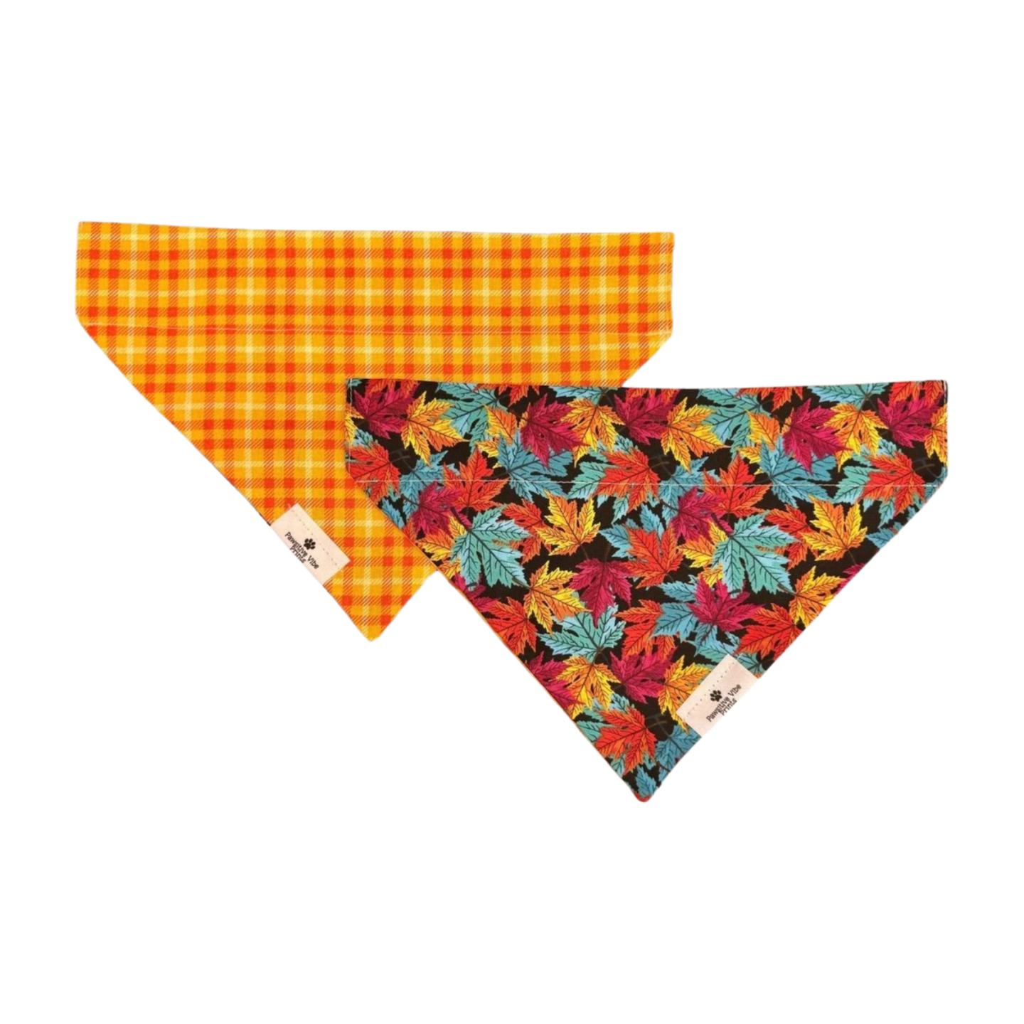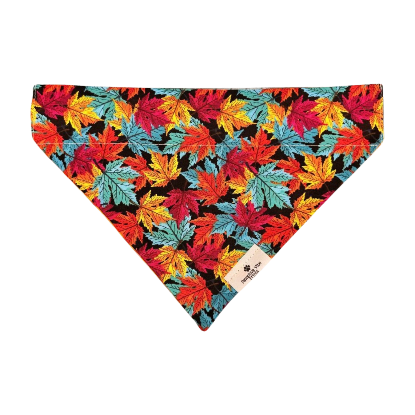 Over the collar design makes it so the bandana stays on as long as the collar is on. This bandana has two prints for the price of one!
