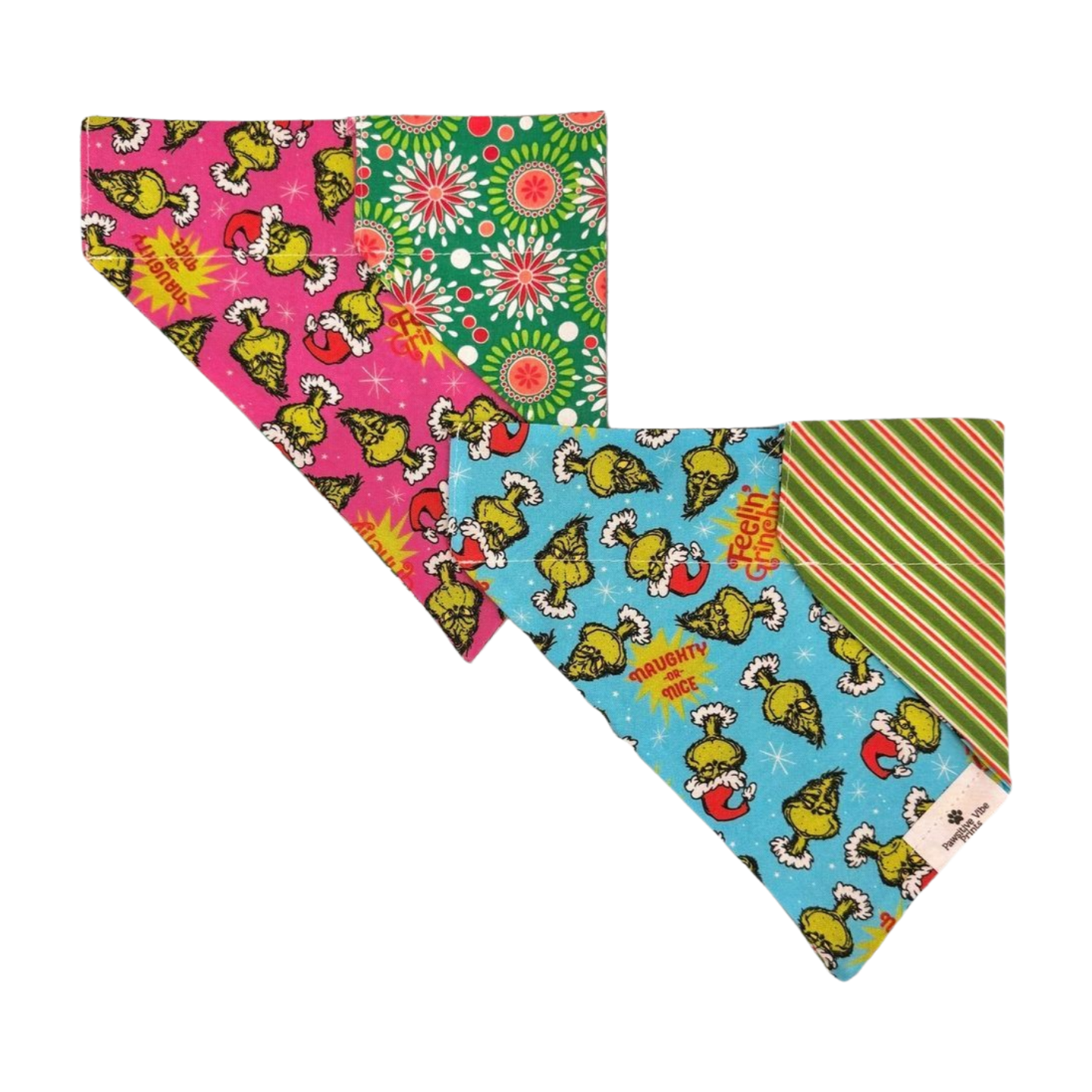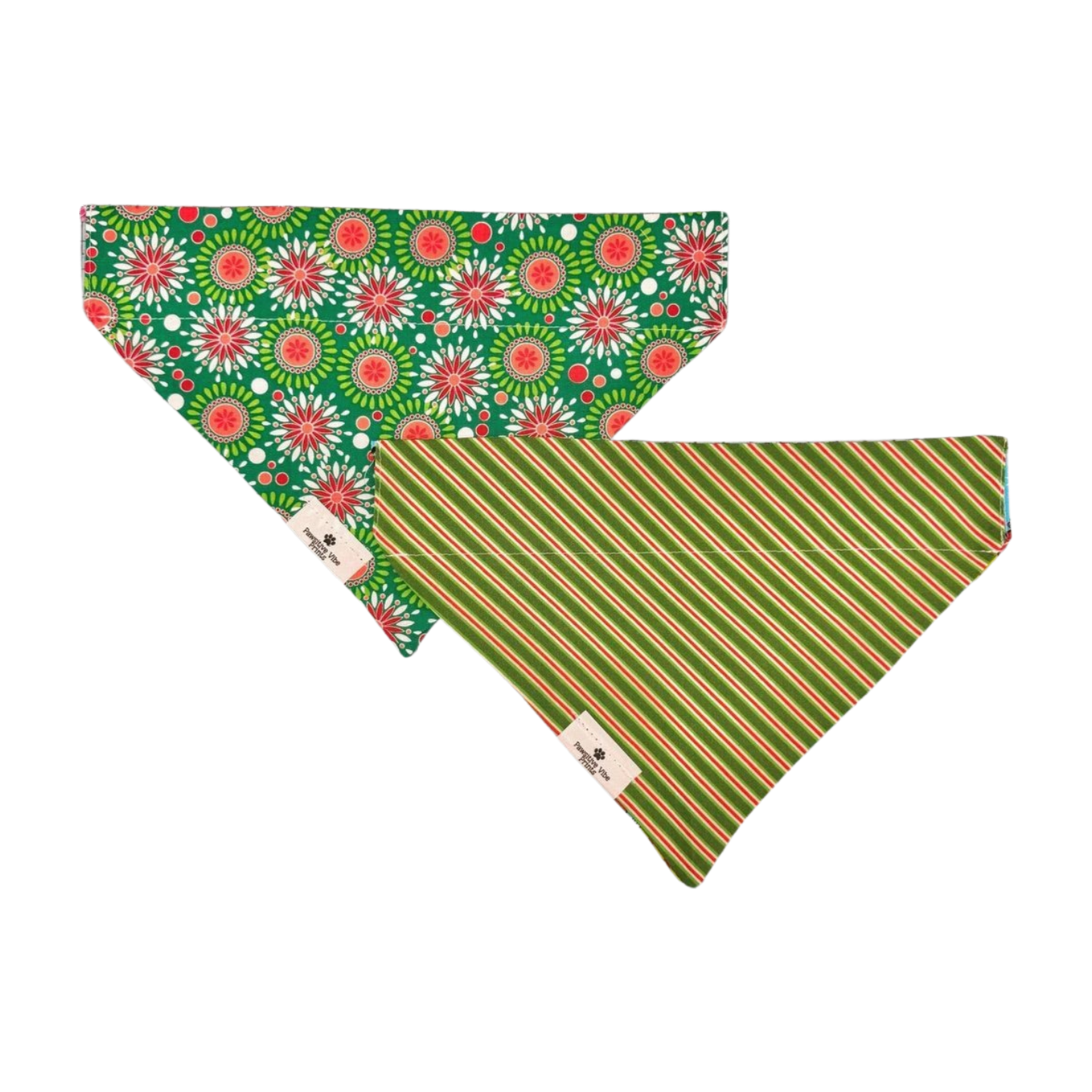 Over the collar design makes it so the bandana stays on as long as the collar is on. This reversible bandana is pawfect for your pets wardrobe!