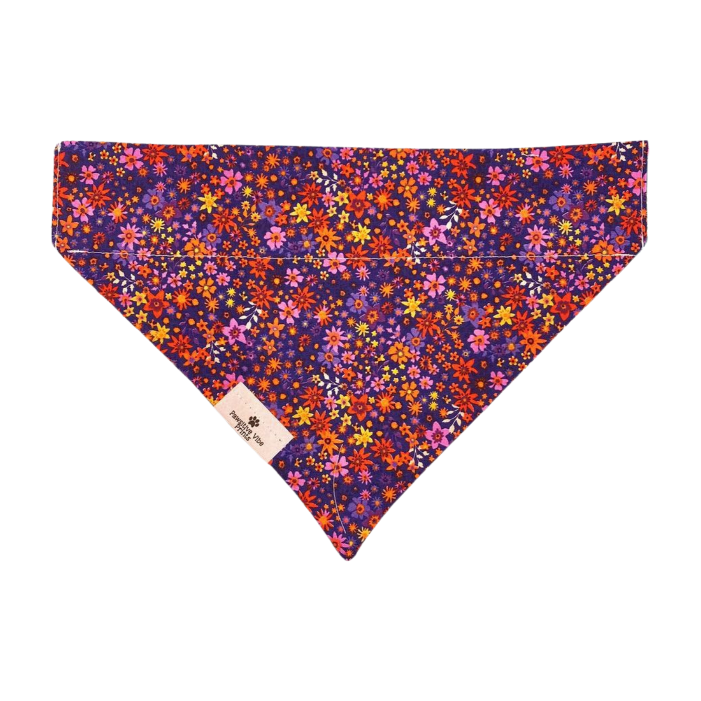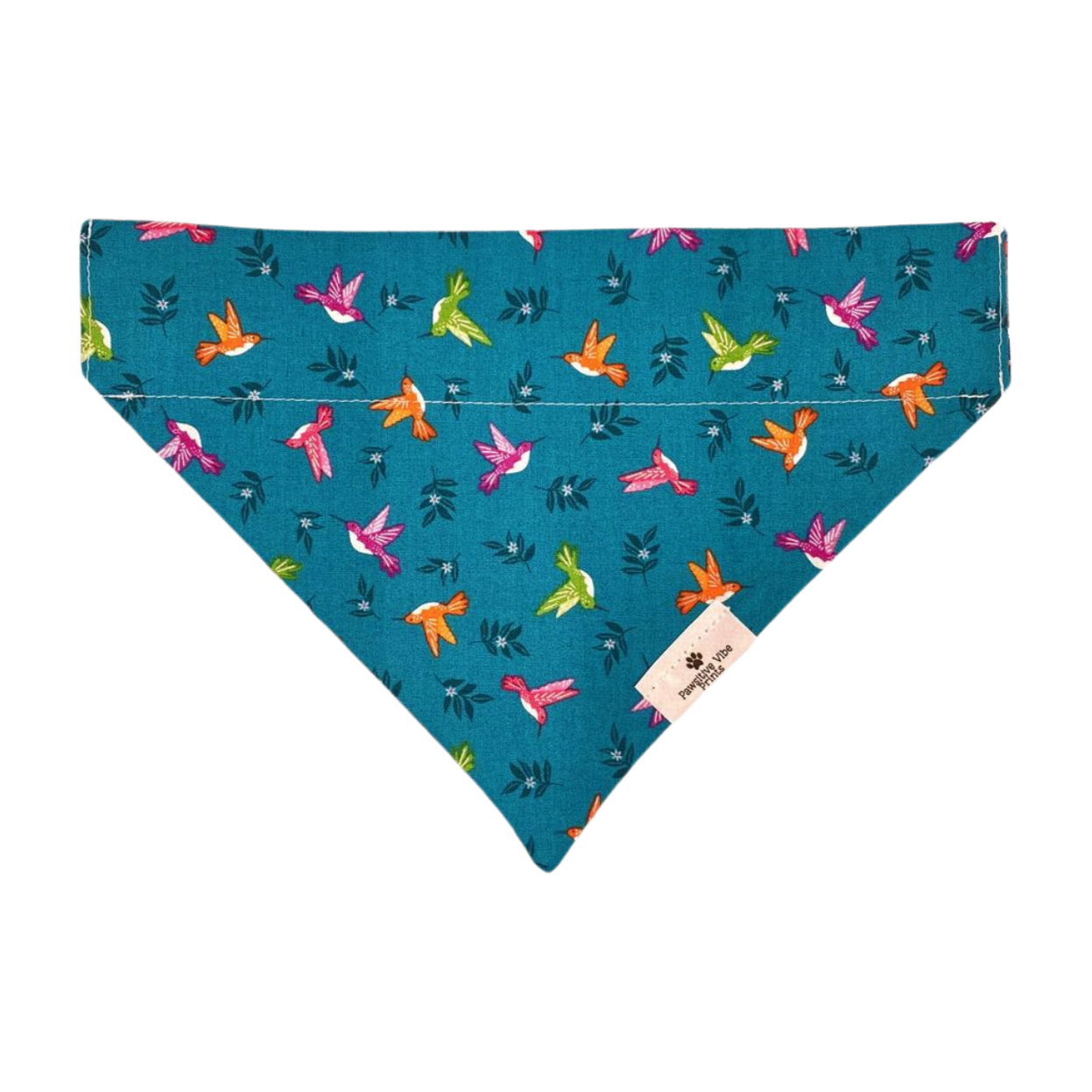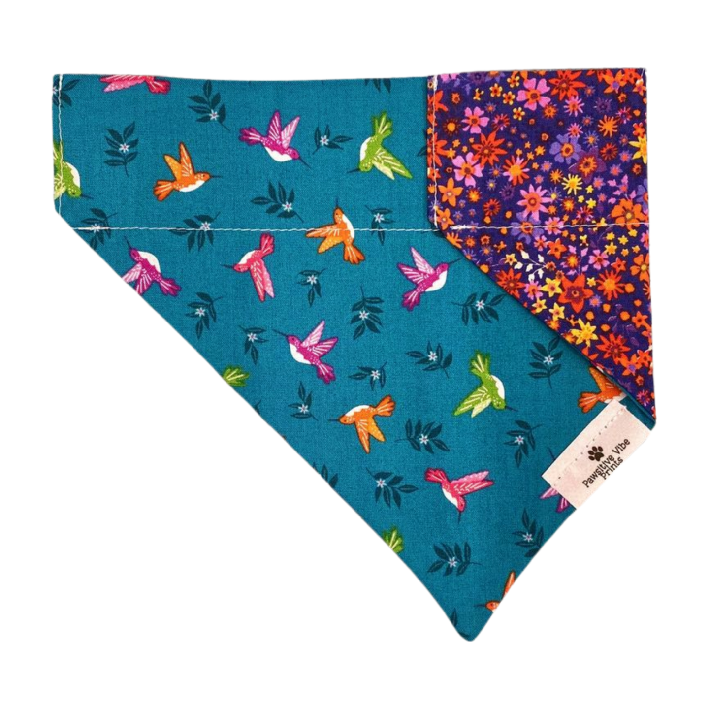 Over the collar design makes it so the bandana stays on as long as the collar is on. This bandana has two prints for the price of one!