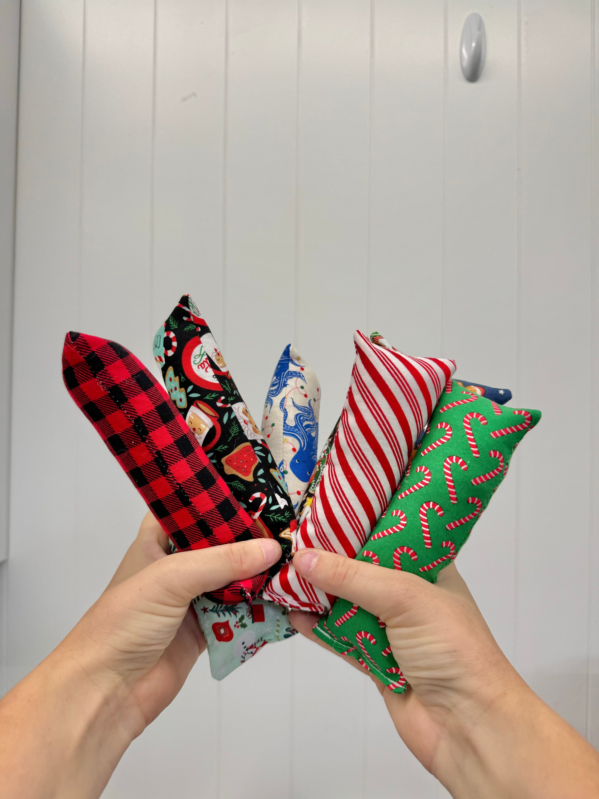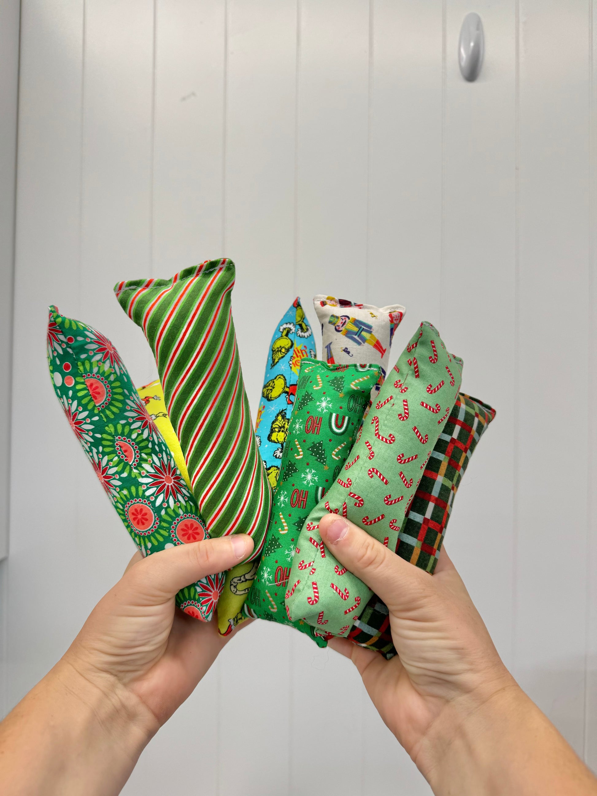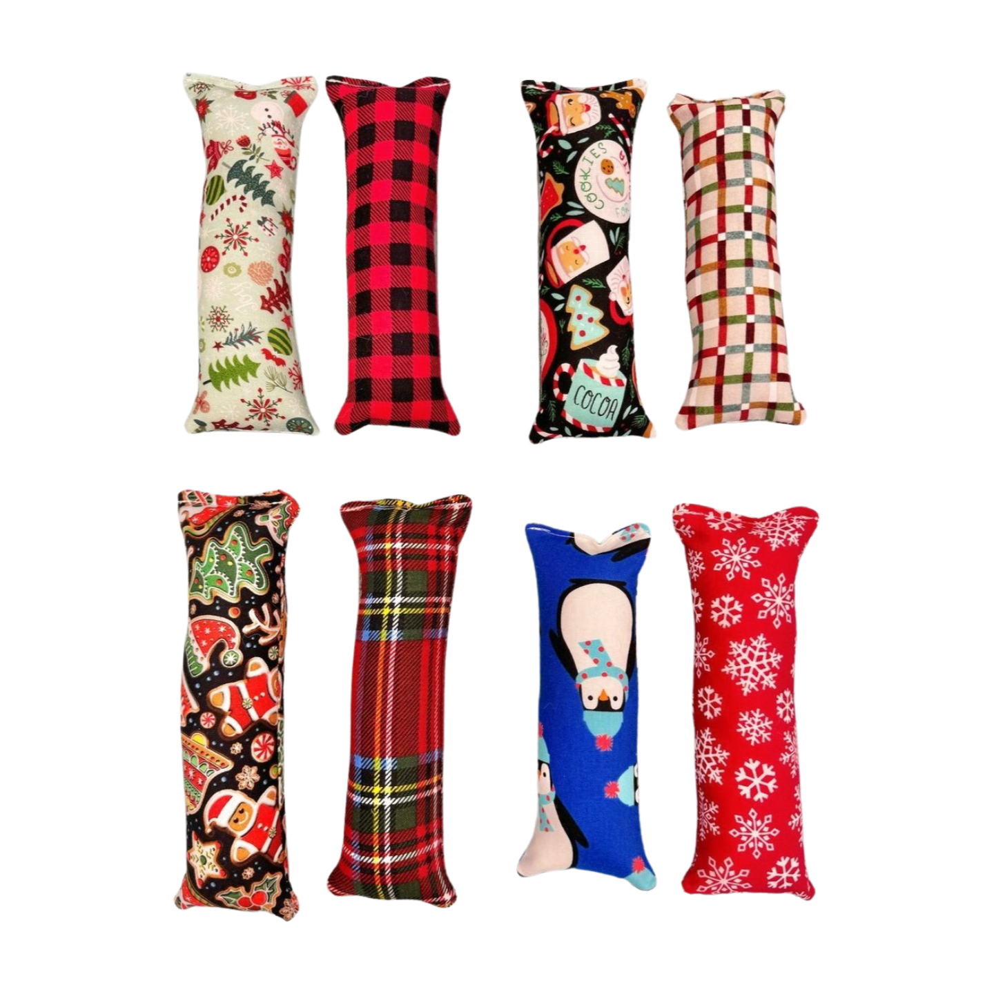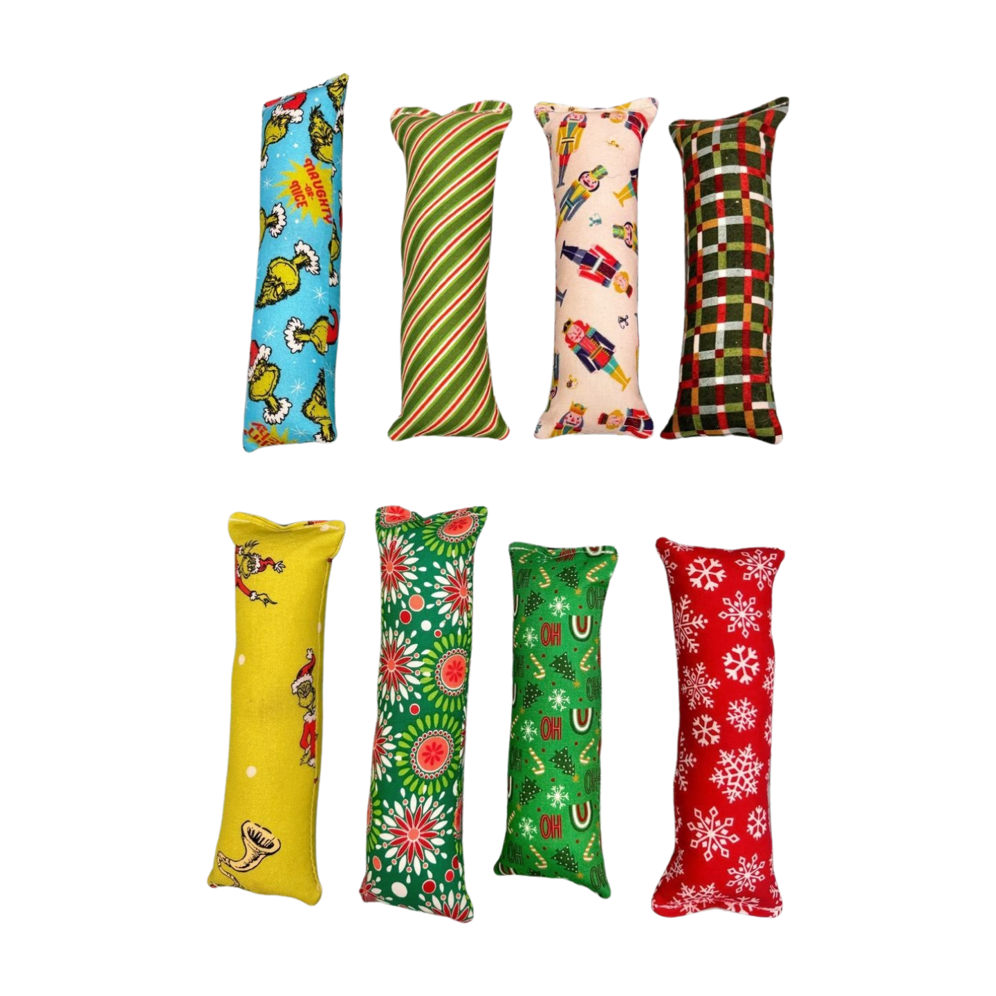 each cat kicker is made from 100% cotton fabric, machine stitched for durability, and filled with stuffing and 3 large scoops of catnip silvervine mixture!