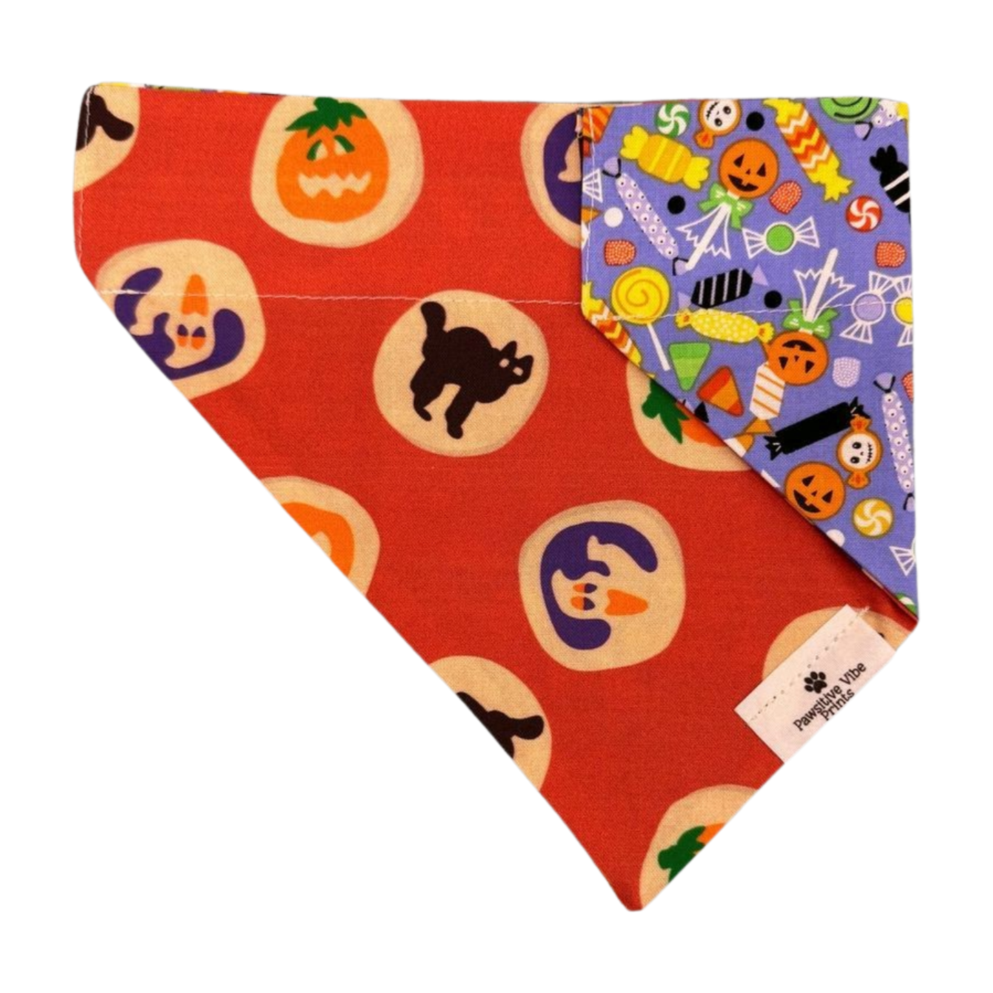 Over the collar design makes it so the bandana stays on as long as the collar is on. This bandana has two prints for the price of one!
