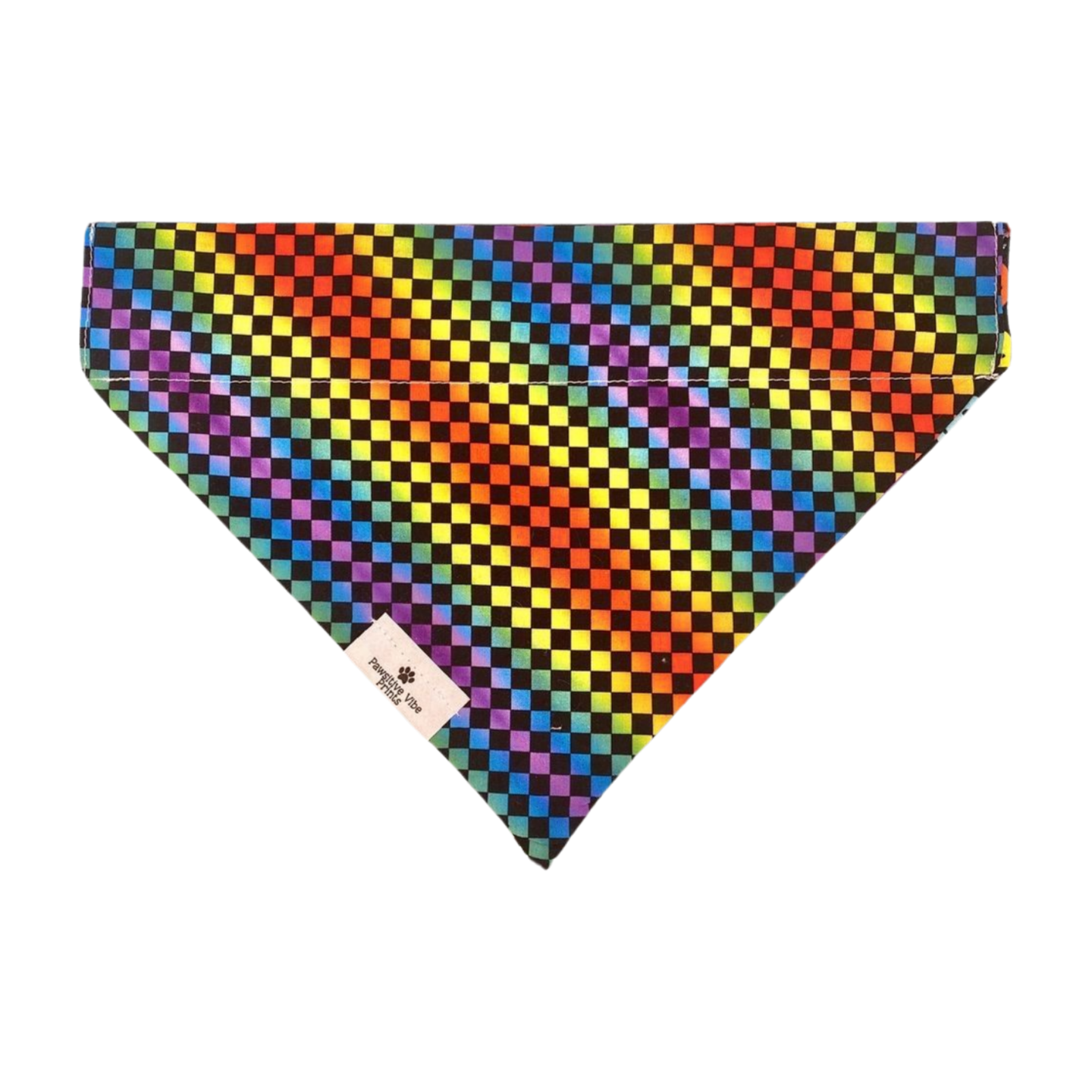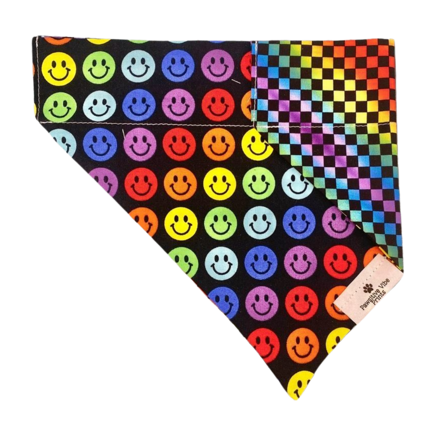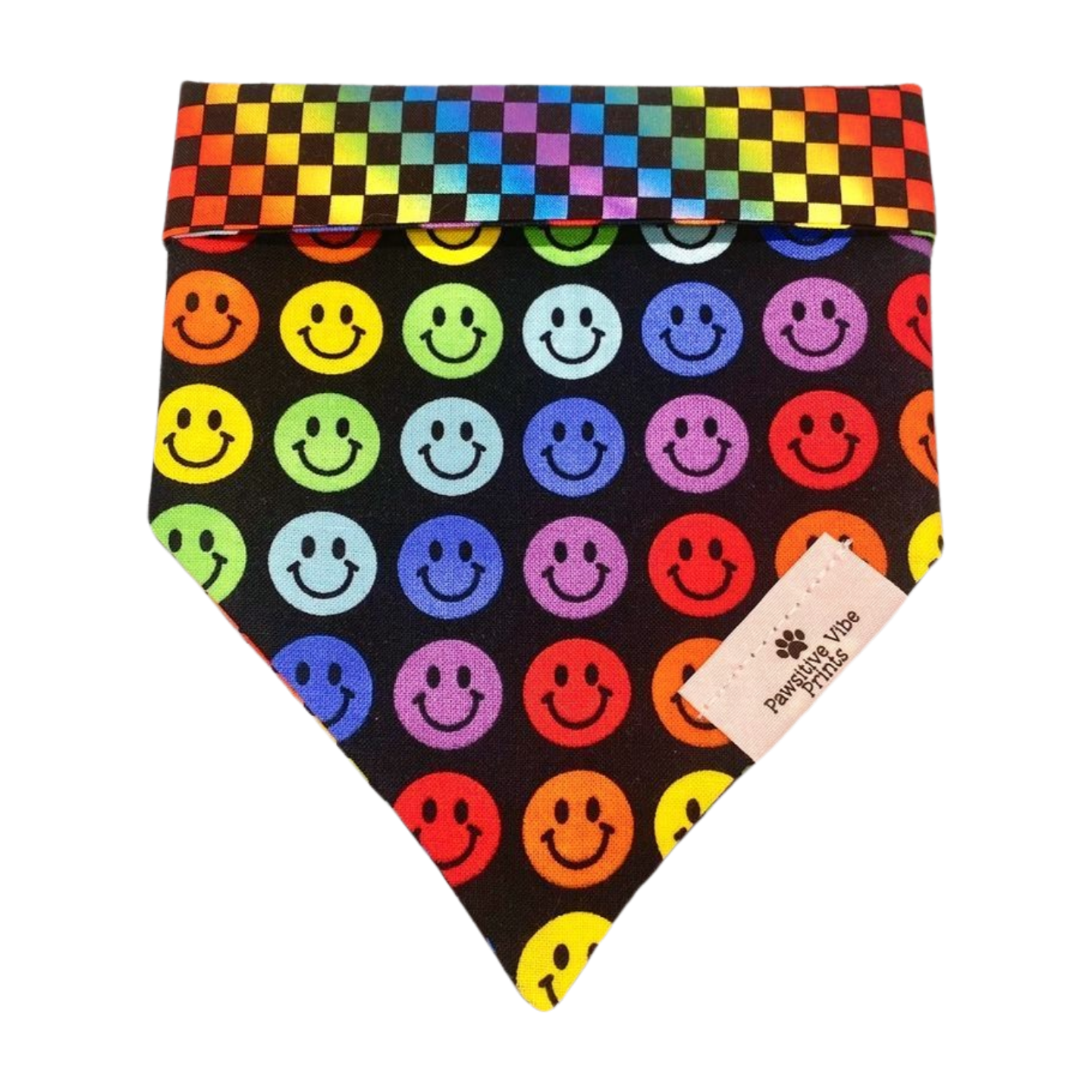 Over the collar design makes it so the bandana stays on as long as the collar is on. This bandana has two prints for the price of one!