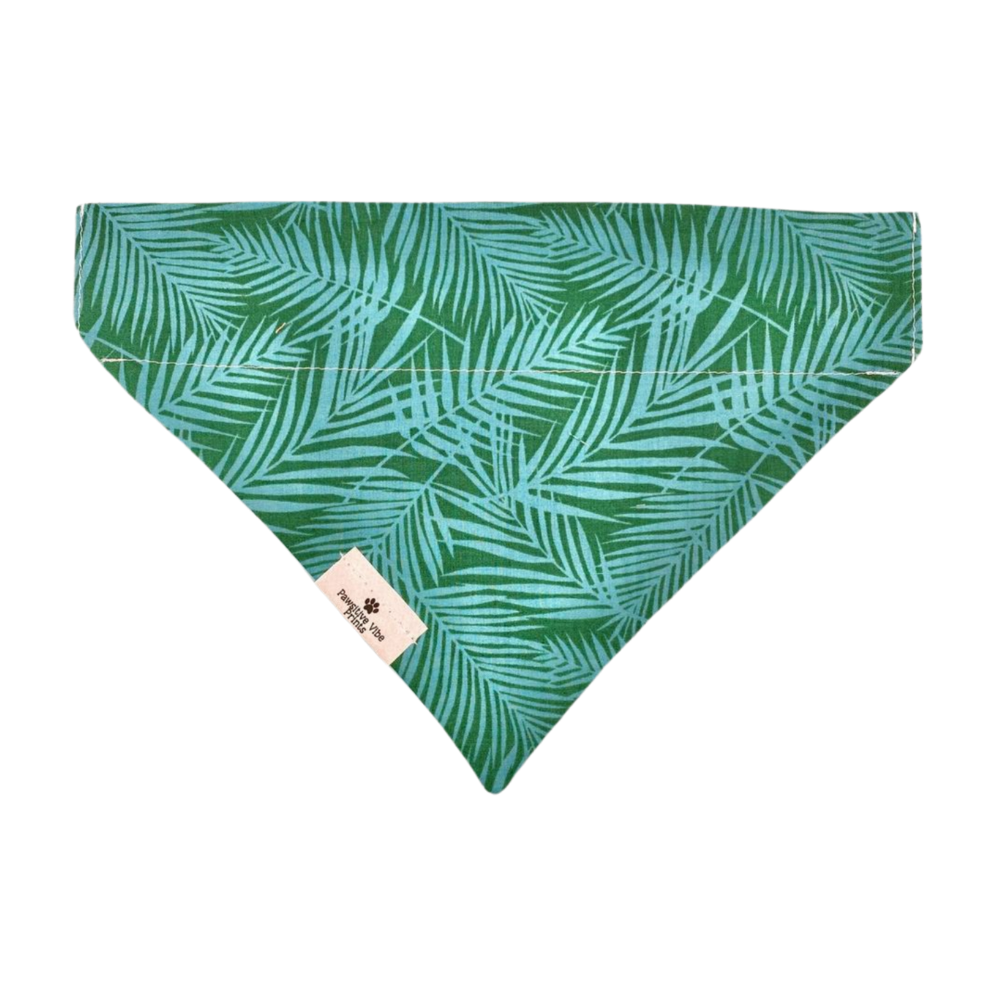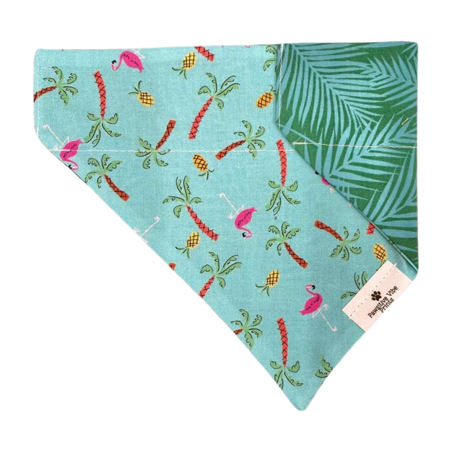 Over the collar design makes it so the bandana stays on as long as the collar is on. This bandana has two prints for the price of one!